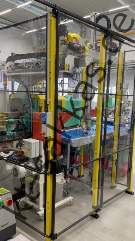 An unserer vollelektrischen 50t JSW Maschine wurde von ProOptima eine komplette Automatisierungszelle mit Roboter und Vereinzelung von Metalleinlegeteilen installiert und angefahren.