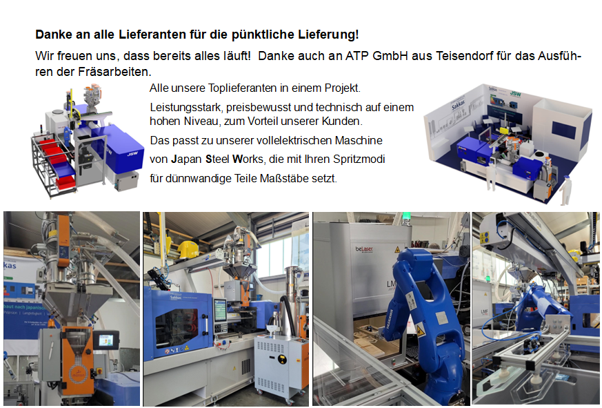 Neben unsern Standardlieferanten JSW,  Campetella, Motan, Frigel bedanken wir uns bei Gabriel Chemie und Be-Laser sowie der Firma Yaskawa für den 6-Achser.
